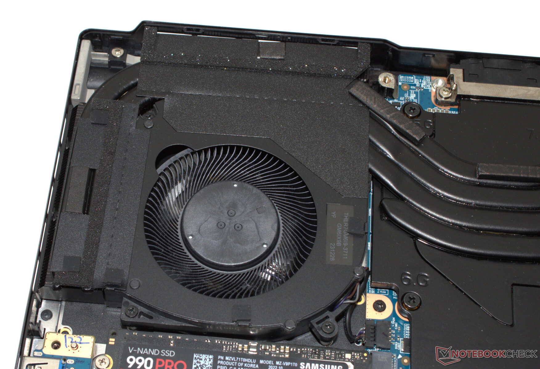 Cihazın tabanındaki tüm vidaları çıkardıktan sonra, taban kapağı bir mızrap ya da düz bir spatula yardımıyla ayrılabilir. Bu sayede RAM yuvalarına (her ikisi de dolu), fanlara ve bataryaya erişebilirsiniz. SSD ve SSD yuvaları (PCIe 4, M.2 2280) ve Wi-Fi modülü ek, vidalı plakalarla kaplıdır.