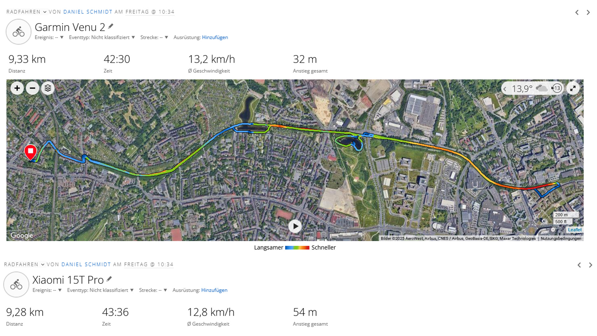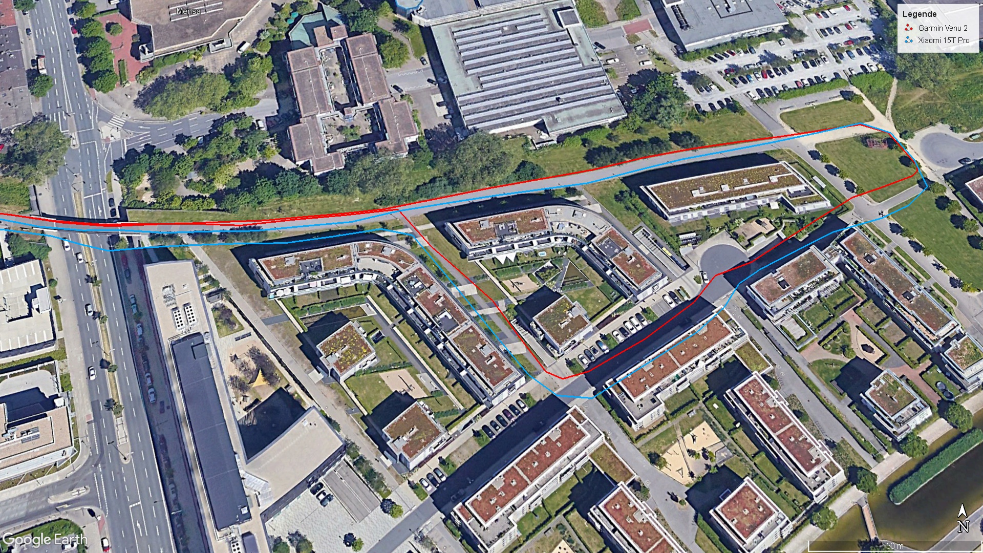 Bir bisiklet sürüşü sırasında Xiaomi 15T Pro'yu Garmin Venu 2 ile karşılaştırdık. Zaman zaman, akıllı telefonun kaydedilen izi gerçek rotadan biraz saptı, ancak navigasyon görevleri için pratik bir sınırlama yoktu.
