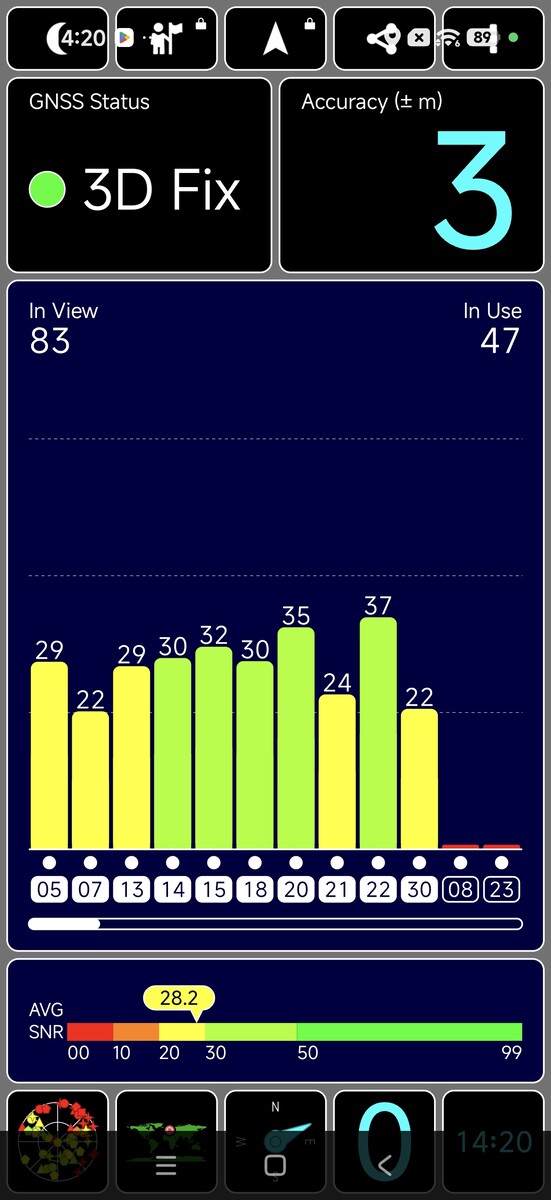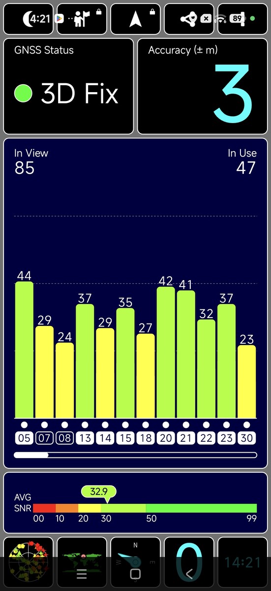 Dışarıda, Xiaomi 17 Pro hızla bir uydu sinyali aldı ve konumunu 3 metrelik bir doğrulukla belirledi. Konumlandırma için çift bant modunda başlıca küresel uydu ağlarını kullanıyor.