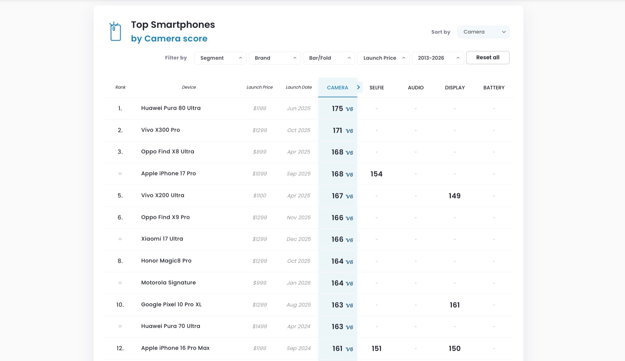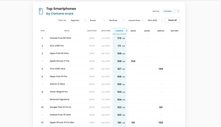 Bu puan, mevcut akıllı telefon sıralamasında yalnızca altıncı sırada yer almak için yeterli Apple iPhone 17 Pro'nin çok gerisinde 168 puanla dördüncü sırada yer alıyor Huawei Pura 70 Ultra'nin 175 puanla en üst sırada yer aldığı görülüyor. Daha spesifik olarak, Xiaomi hiçbir kategoride en yüksek puanı bile alamıyor. Xiaomi 17 Ultra'daki video sorunları nedeniyle iPhone 17 Pro'nun önde olduğu görülüyor.