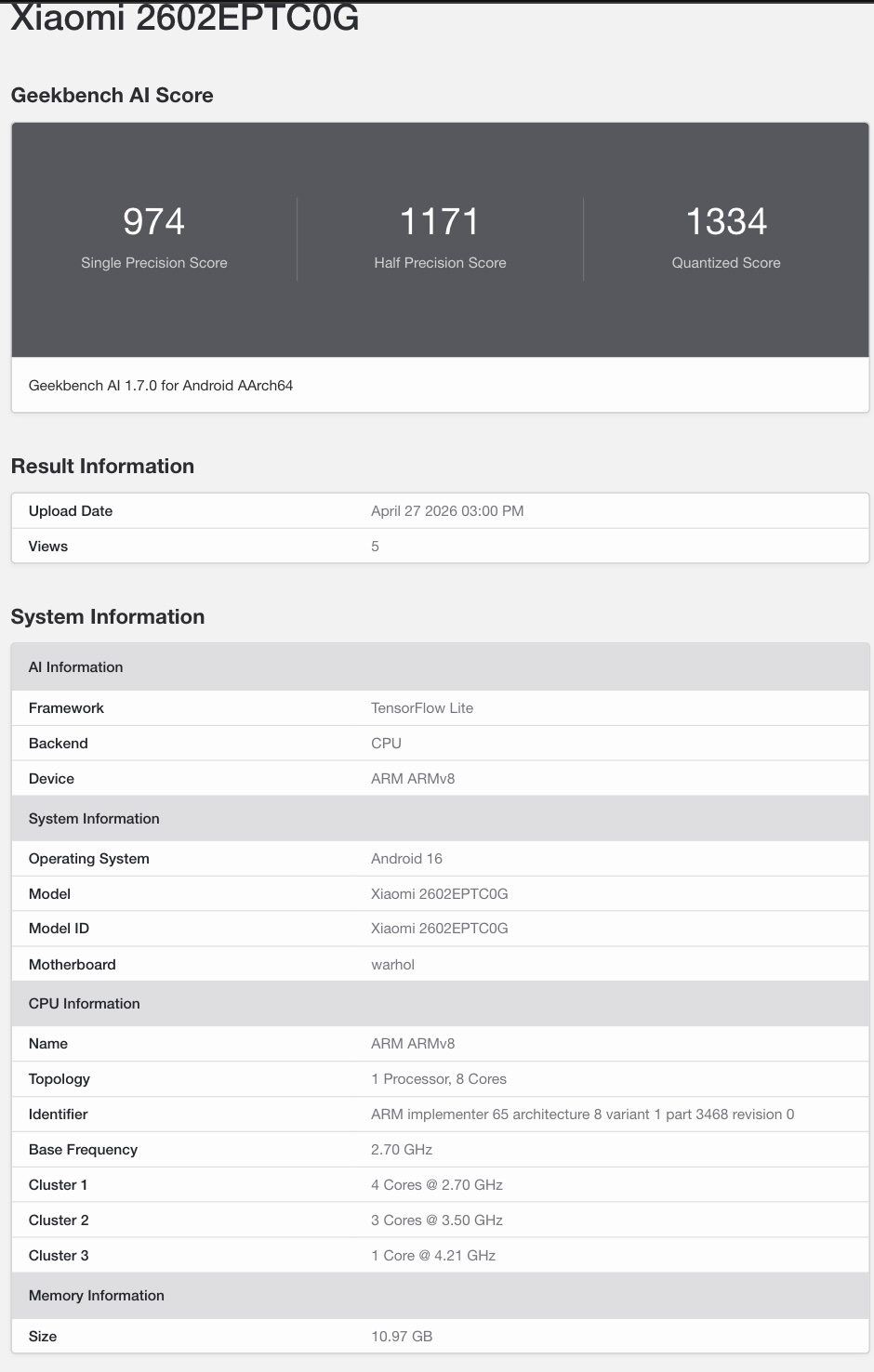 Benchmark'a göre, Xiaomi 17T Pro gücünü şu modelden alacak Dimensity 9500 12GB RAM ile birlikte yonga seti. Referans olarak, Dimensity 9500 MediaTek'in 3nm sürecine dayanan amiral gemisi yonga setidir ve aşağıdaki gibi cihazlara güç sağlar Vivo X300 Pro ve Oppo Find X9 Pro. Geekbench AI testinde Xiaomi 17T Pro, tek hassasiyet testinde 974 puan, yarım hassasiyet testinde 1.171 puan ve nicelleştirilmiş testte 1.334 puan alıyor.
