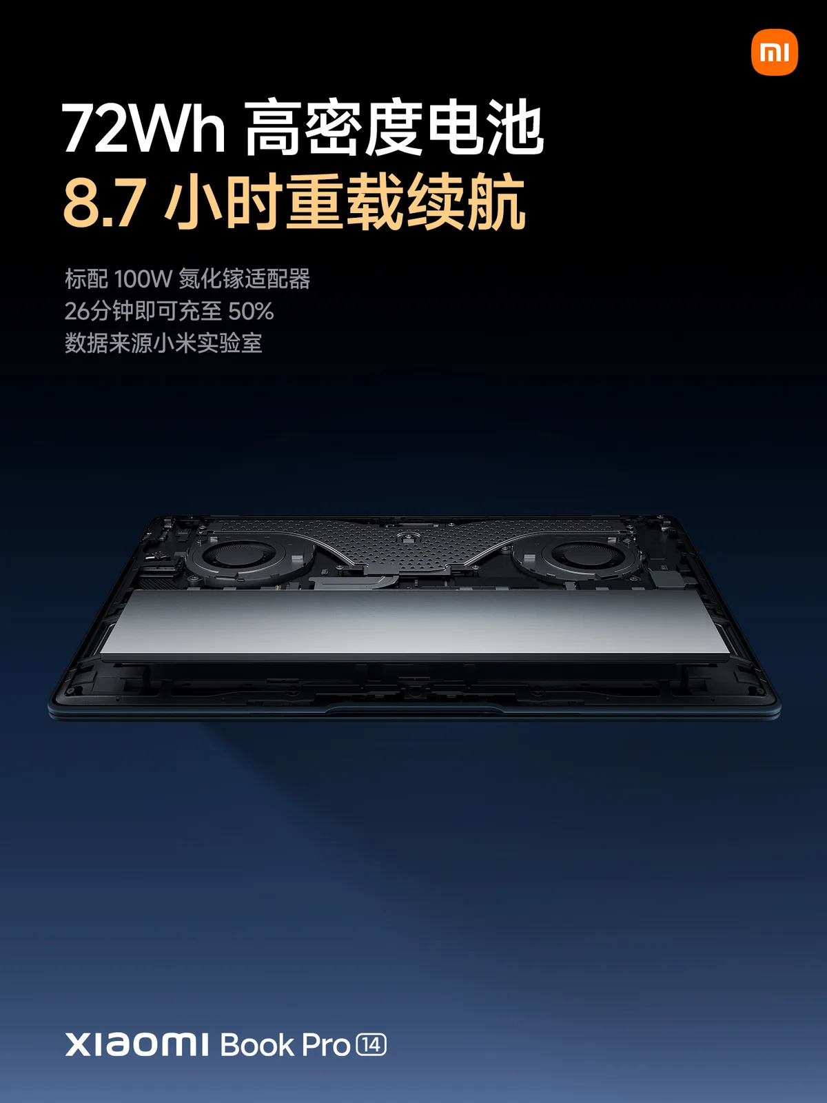 Ayrıca Xiaomi, dizüstü bilgisayarın 500 nit, 120 Hz ve 3.120 x 2.080 piksel OLED ekranına güç sağlamak için 100 W şarj destekli 72 Wh pil takıyor. Xiaomi bu 3:2 ekranı 140 x 93 mm dokunmatik yüzey ve 1,3 mm tuş hareketi sağlayan arkadan aydınlatmalı tuşlarla tamamlıyor. Book Pro 14, ince boyutuna rağmen tam boyutlu HDMI ve USB Type-A bağlantı noktaları da içeriyor.
