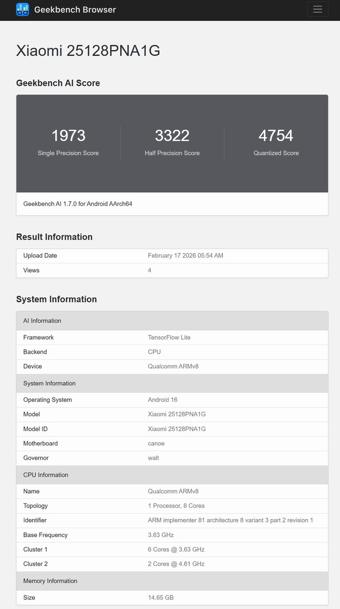 Son zamanlarda, sızıntılar küresel olarak kullanılabilirliğine odaklanmıştır Xiaomi 17 ve Xiaomi 17 Ultra. Kısacası, çeşitli kaynaklar, paritenin şu anki fiyatlarla eşleşmesini bekliyor Xiaomi 15 Ultra ve onun küçük kardeş (Amazon'da 809$). Leica Edition ile ilgili eşdeğer ayrıntılar şimdilik bilinmezliğini korurken, küresel sürüm nihayet Geekbench'te 25128PNA1G model numarasıyla göründü.