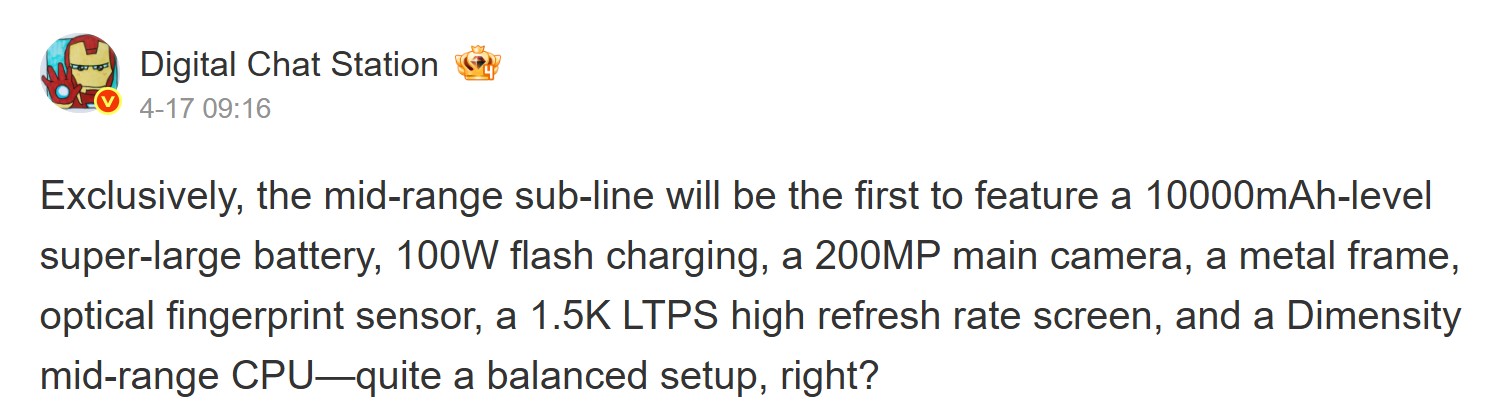 Üretken sızıntıcı Digital Chat Station'dan gelen bir başka rapor, serinin 10.000mAh bataryalı bir telefon içereceğini ima etti. Bu, mevcut serinin en üst seviyesinden oldukça büyük bir sıçrama olacaktır ve sızıntı yapan kişi bir kez daha benzer bir şey bildirdi.