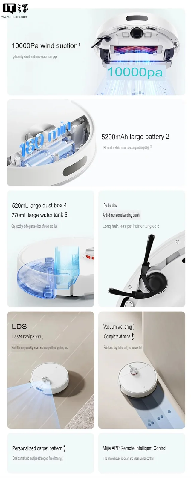 Dört temizleme modu Mijia Robot Vacuum 4'e biraz esneklik kazandırıyor ve çift dolaşma önleyici yan fırçalar, Xiaomi'nin çoğu robot süpürgeyi üç ayda bir bakım işine dönüştüren uzun saç sorununu gerçekten düşündüğünü gösteriyor. 520 ml çöp kovası ve 270 ml su tankı kapasitesi, açık plan koşullarında 300 metrekareye kadar alanı kapsıyor. Bu, büyük bir daire veya küçük bir ev için yeterli olacaktır ve makul 5.200 mAh pil, robot süpürgesini standart süpürme ve paspaslama modunda 180 dakika çalıştıracaktır.