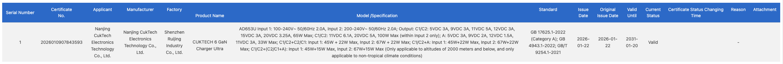 Şimdi de Cuktech 6 GaN Charger Ultra, Çin Kalite Sertifikasyon Merkezi (CQC) veri tabanında yer aldı. Giriş, bu yayınlanmamış aksesuarın CCC (Çin Zorunlu Sertifikası) veya 3C sertifikasına sahip olduğunu gösterir. Bu sayfa aynı zamanda bu ürünün bazı özelliklerini de ortaya koymaktadır.