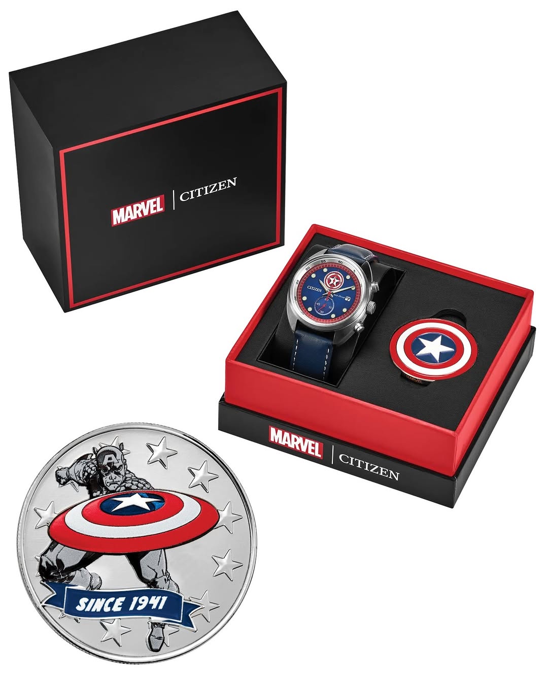 Vatandaş ABD, CA7046-46W'yi resmi olarak duyurdu kaptan Amerika'nın 85. yıldönümünü kutlamak için tasarlandı. Saat, Citizen'in karakter işbirlikleri için standart bir kronograf platformunun kullanıldığı olağan yaklaşımını sürdürüyor. Bu, bazıları için hala günlük giyilebilir bir model olarak çalışması gereken bir hatıra modelidir.