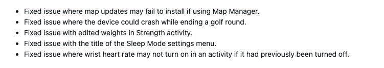 Bunun da ötesinde, Uyku Modu ayarları menüsünün başlığı için bir düzeltme var. Ayrıca Garmin, daha önce belirli bir aktivite için devre dışı bırakıldığında bilekten kalp atış hızı kaydının otomatik olarak başlamamasına neden olan bir sorunu da çözdü.