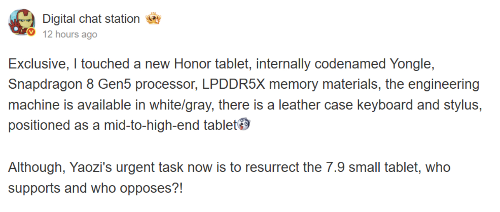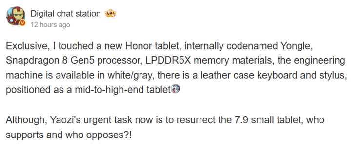 Aşağıdaki ekran görüntüsünde görüldüğü gibi, Digital Chat Station henüz piyasaya sürülmemiş Honor tabletin adını vermiyor. Bunun yerine, kod adı olan Yongle'ye atıfta bulunuyorlar. Bununla birlikte, oyundaki yonga seti 'Yongle'nin MagicPad 3 Pro yerine MagicPad 3 veya Pad GT2 Pro'nun yerini alacağını gösteriyor. Özellikle, Honor 'un 'Yongle'yi aşağıdakilerle donattığı söylenir Snapdragon 8 Gen 5 temelini oluşturan OnePlus 15R (Amazon'da 699,99 $).