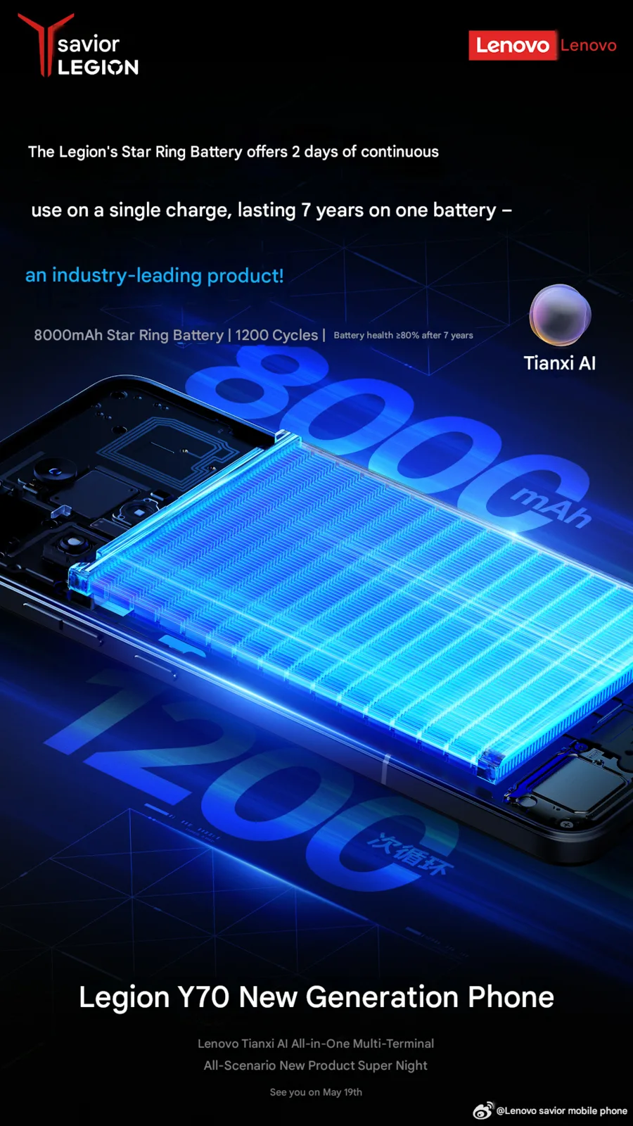Bu teaser'da Lenovo, pilin 7 yıl sonra bile kapasitesinin en az %80'ini koruyabileceğini ve bunun gibi iddiaların akıllı telefon pazarında nadir olmadığını belirtiyor. Şirket ayrıca yaklaşmakta olan Legion oyun telefonunun "özel bir oyun anteni" ile donatıldığını paylaşıyor