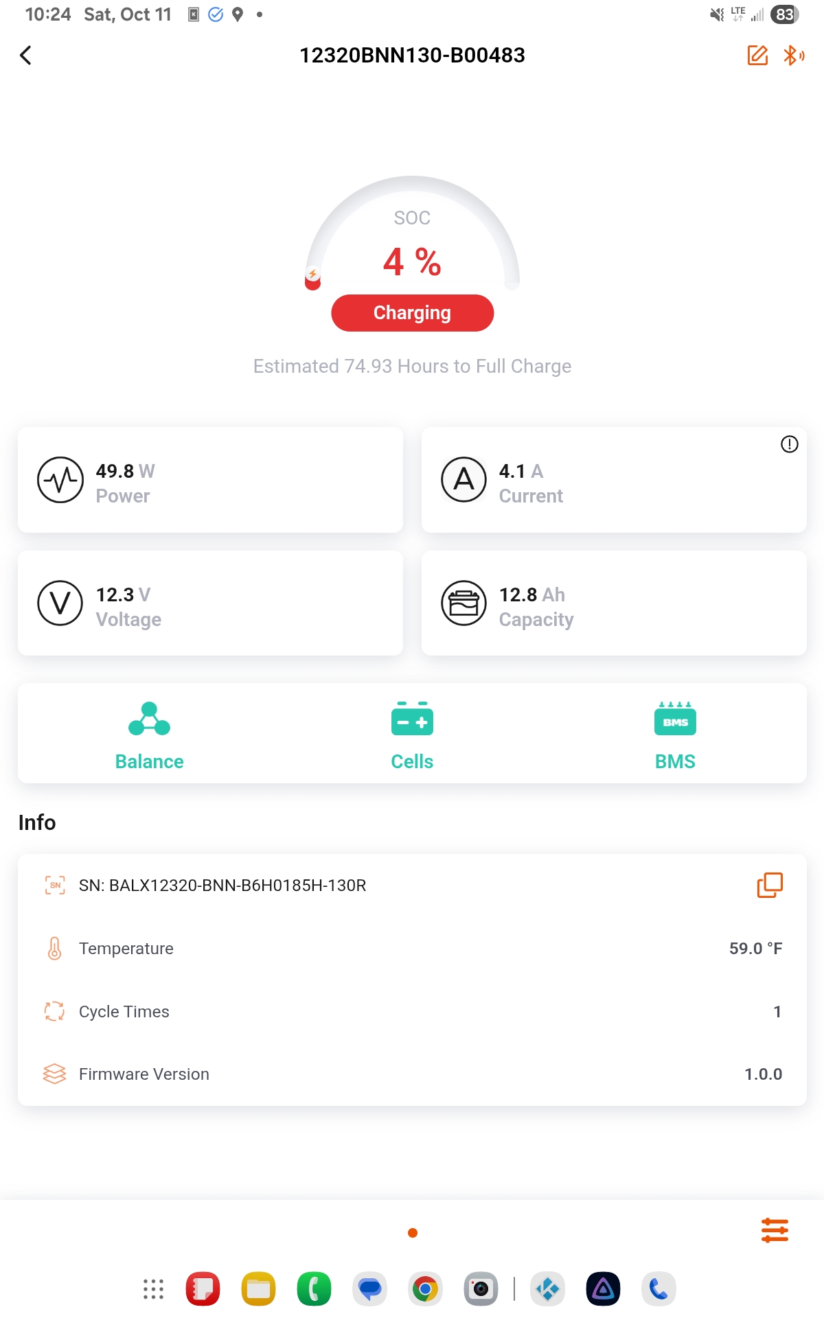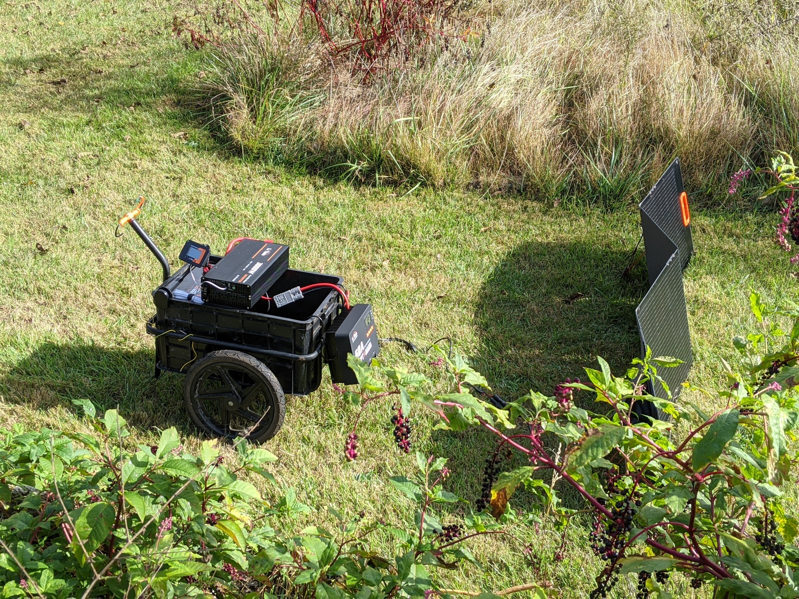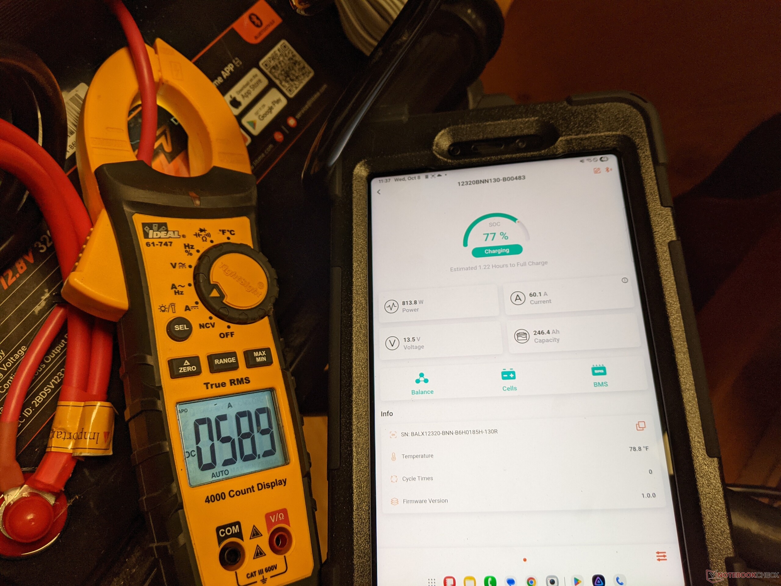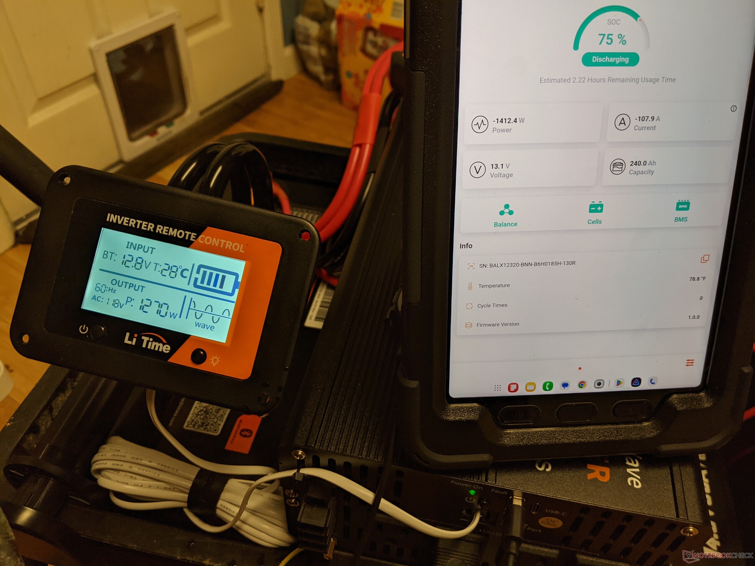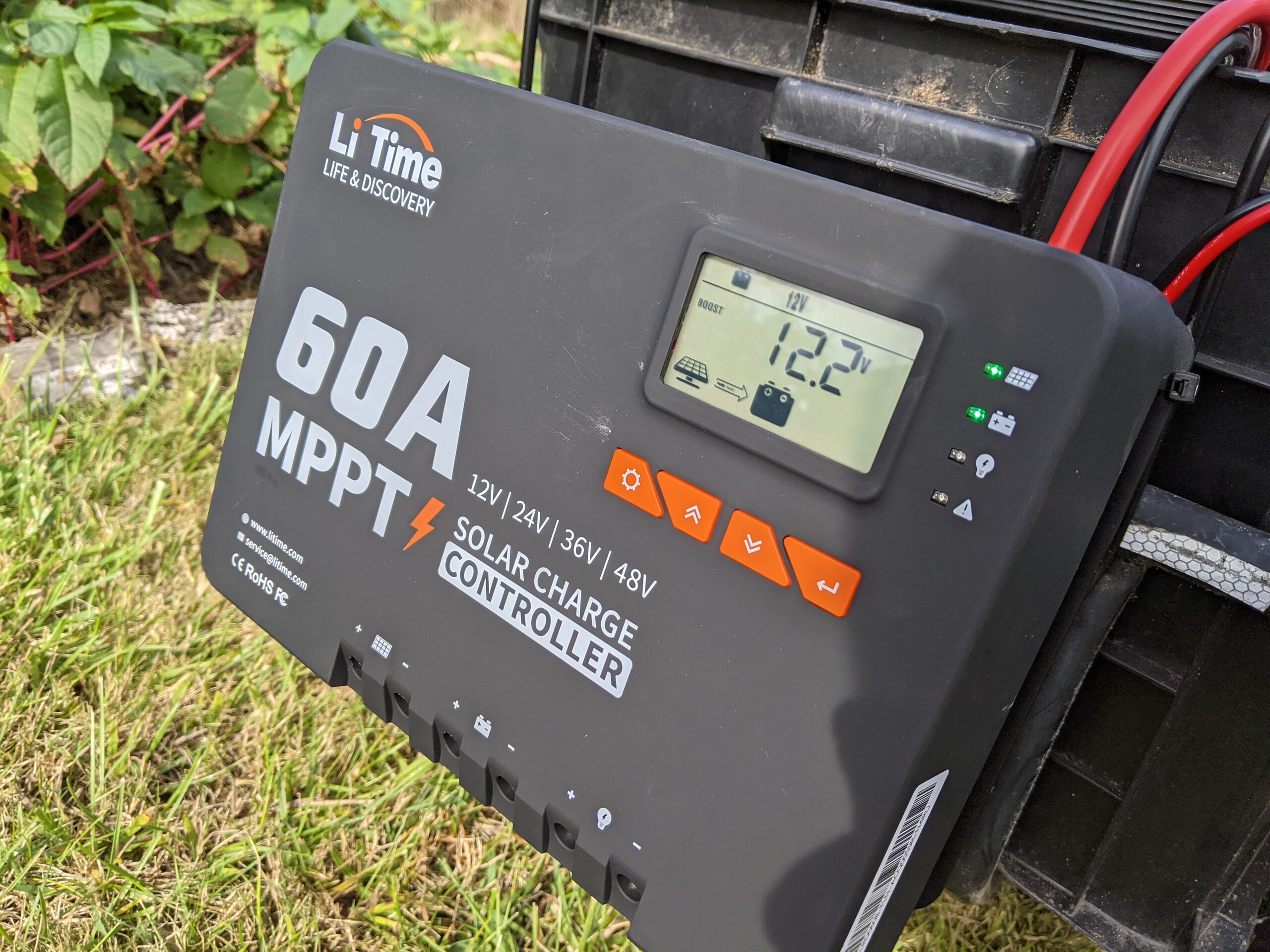 Tam şarj, 38F hava sıcaklığı ve 400W ısıtıcı ile kurulum, küçük bir evde gece boyunca tam 9 saat boyunca test edildi. Kurulum hayal kırıklığına uğratmadı ve sekiz buçuk saat boyunca ısıtıcıya istikrarlı bir güç akışı sağladı. Batarya öngörülen dokuz saatin tamamına dayanabilirdi, ancak invertörün düşük güç uyarı sesi bataryanın tamamının tüketilmemesini tavsiye etti. Bu noktada gün ışığı olduğu için sistem daha sonra yeniden şarj edilmeye başlamak üzere 200W'lık bir güneş paneline bağlandı. Solar Şarj kontrolörü iyi performans gösterdi ve aküyü şarj ediyordu; ancak panellerin düşük watt gücü nedeniyle tahmini şarj süresi 65 saat aralığındaydı. Bu nedenle, 200W'lık bir panel ek güç için harikadır ancak rutin şarj için en iyi seçenek değildir. Solar şarj kontrolörü su geçirmez değildir.