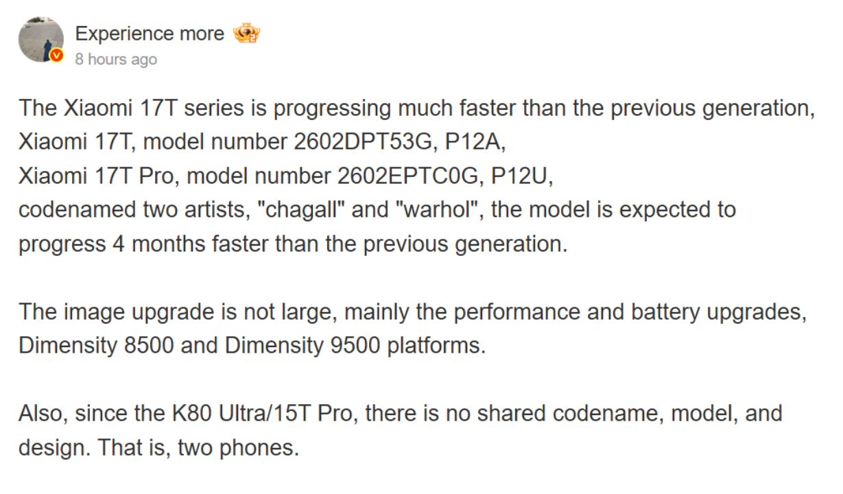 Bunun yerine, Xiaomi 17T Pro ve Redmi K90 Ultra'nın iki farklı akıllı telefon olduğunu iddia ediyorlar. Weibo'da yazan Experience more, hem Xiaomi 17T Pro hem de Xiaomi 17T'nin 'önceki nesilden dört ay ileride' olmasını bekliyor. Bu nedenle, Xiaomi 17T serisinin Eylül 2026'dan ziyade Mayıs 2026'nın ortasından sonuna kadar küresel çıkışını yaptığını görebiliriz.