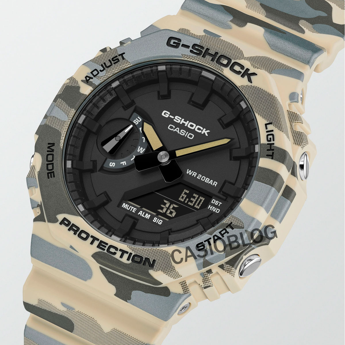 Ekteki görsellerde de görebileceğiniz gibi Casio, her iki modelde de askeri kamuflaj desenleriyle süslenmiş kayışlar ve çerçevelerle eşleştirilmiş ters (negatif) ekranlar ile taktiksel estetiğe büyük ölçüde eğiliyor. GA-2100CM-8A leylak rengi boz kahverengi, gri ağırlıklı bir kamuflaja sahipken, GA-2100CM-5A çölden ilham alan kum ve bej kamuflajı tercih ediyor. Casioblog'a göre, kamuflaj şeritlerinin yanında görünen noktalı desenler, 3D efekti yaratmak için lazer boyama teknolojisi kullanılarak uygulanıyor.