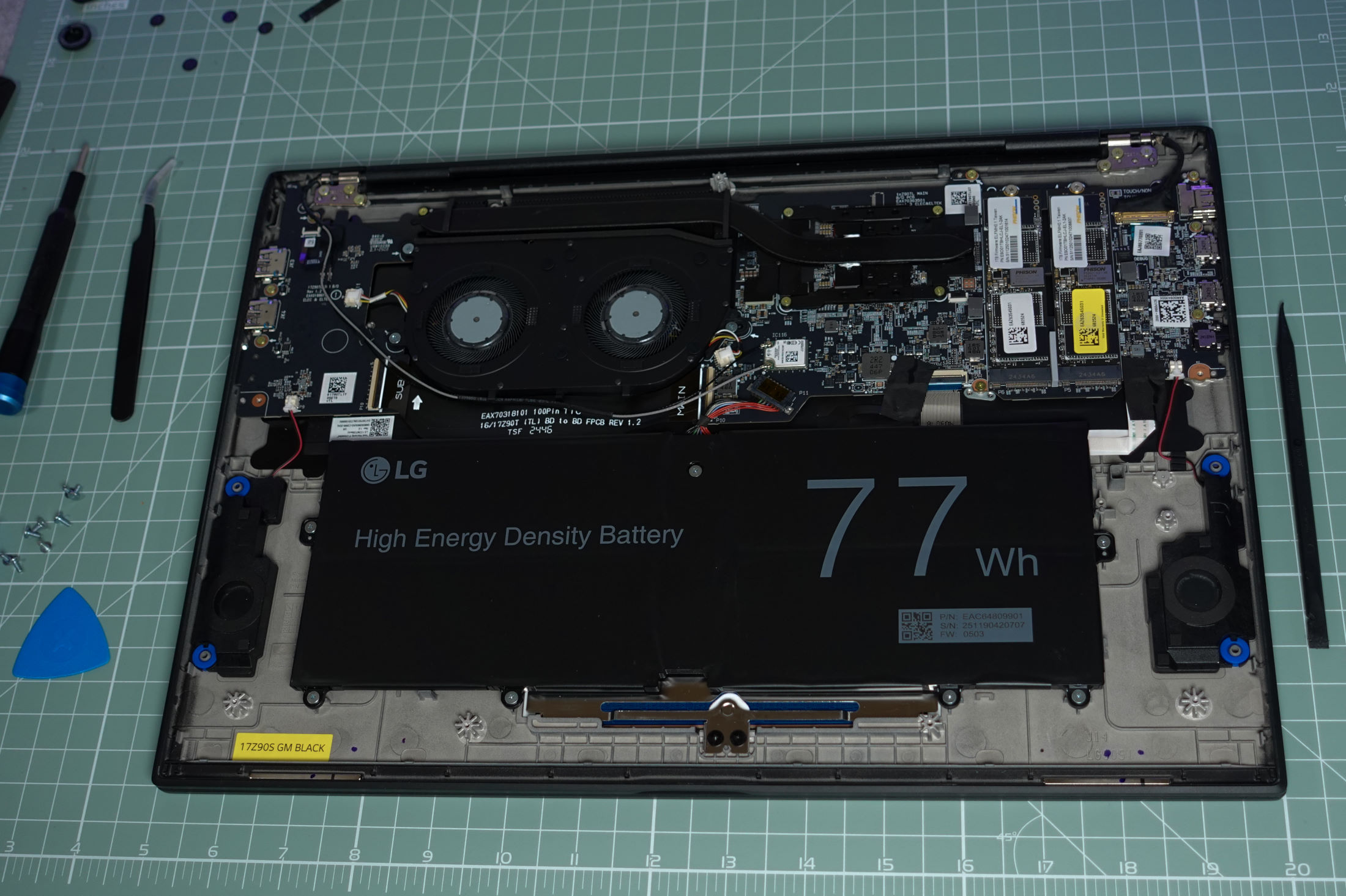 Gram'ın içindeki yapı çok modüler değil. Yine de pil, hoparlörler ve fanlar gibi bileşenler yerlerine yapıştırılmamış. Bu da kolayca değiştirilebilecekleri anlamına geliyor.