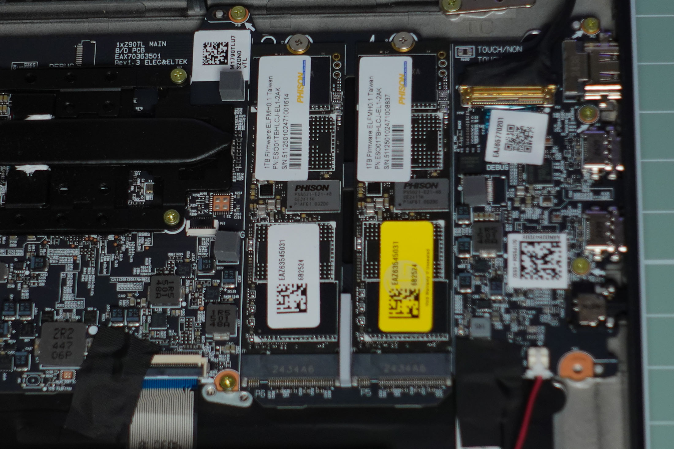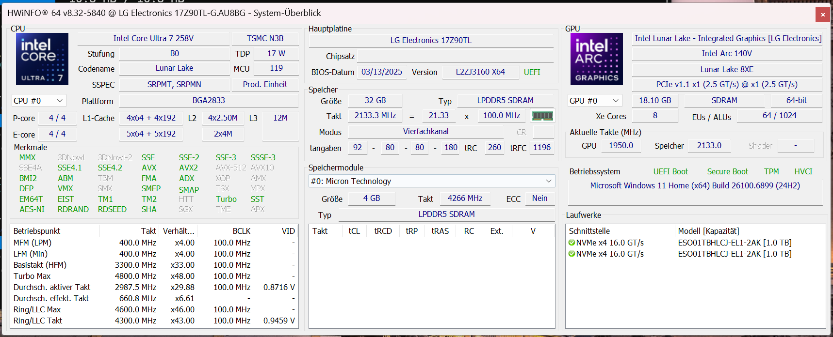 Intel, Lunar Lake ile işlemci tasarımında yeni bir çığır açıyor. Burada odak noktası çoklu iş parçacığından ziyade üstün güç verimliliğidir. RAM, bu CPU'larla doğrudan işlemci paketine entegre edilmiştir, bu da mevcut bellek yapılandırmalarını sınırlar. Şu anda, Lunar Lake işlemcileri içeren Gram modelleri yalnızca Core Ultra 7 256V veya 258V ile mevcuttur. Bu da 16 GB ya da 32 GB RAM'li konfigürasyonlar anlamına geliyor. Test ünitemiz 32 GB yapılandırmasını kullanmaktadır. Ayrıca, piyasada çeşitli depolama konfigürasyonları mevcuttur. Cihazımız, her biri 1 TB depolama alanı sağlayan iki NVMe SSD ile donatılmıştır.