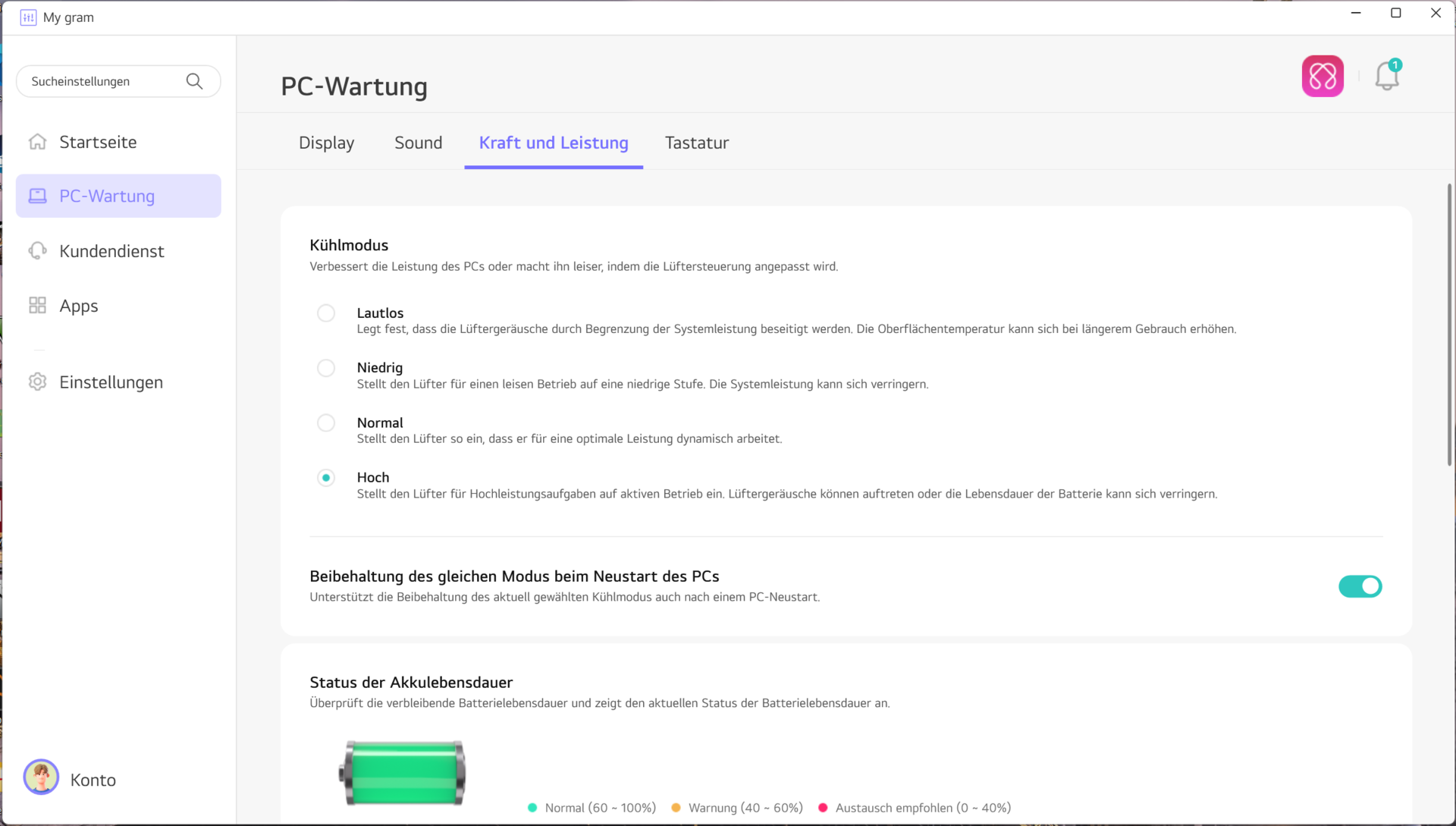 MyGram uygulamasında dört farklı performans profili önceden yapılandırılmıştır. Bu ön ayarlar (neredeyse) sessiz fanlardan yüksek fan kullanımına kadar değişmektedir. Bununla birlikte, stres testinin gürültü ölçümleri sırasında, zorlu senaryolarda "Normal" ayar ile "Yüksek" soğutma modunun yalnızca bir ila iki dB(A) farklılık gösterdiğini keşfettik. Bu nedenle tüm kıyaslama ve ölçümlerimizde en güçlü soğutma modunu kullanmayı tercih ettik.