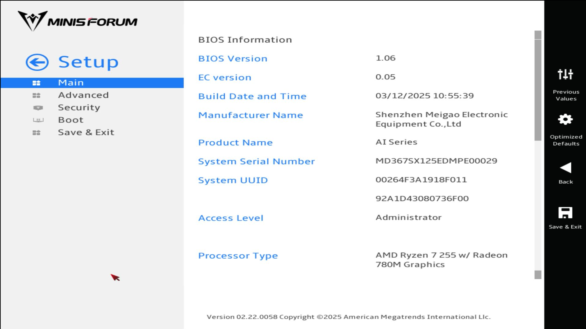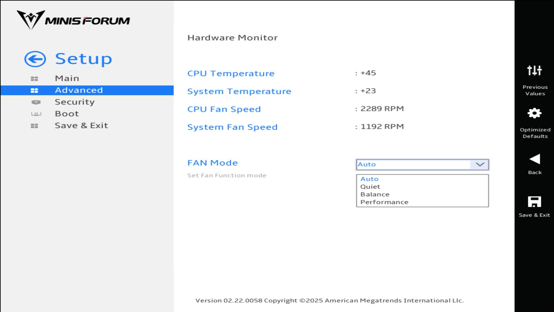Minisforum AI X1'in tüm performans testleri fabrika ayarlarında gerçekleştirilmiştir. Minisforum, UEFI'de hem işlemcinin performans profilinin hem de fan kontrolünün özelleştirilmesine de olanak tanır.