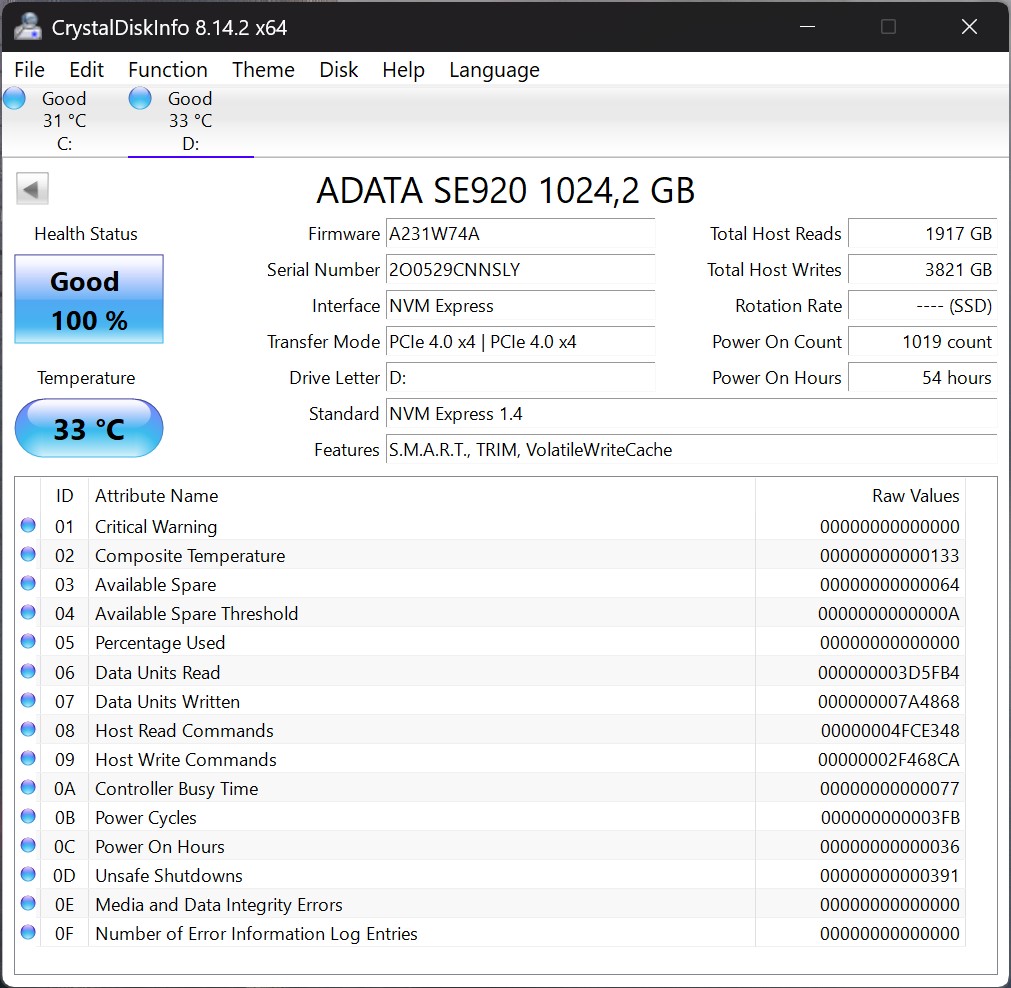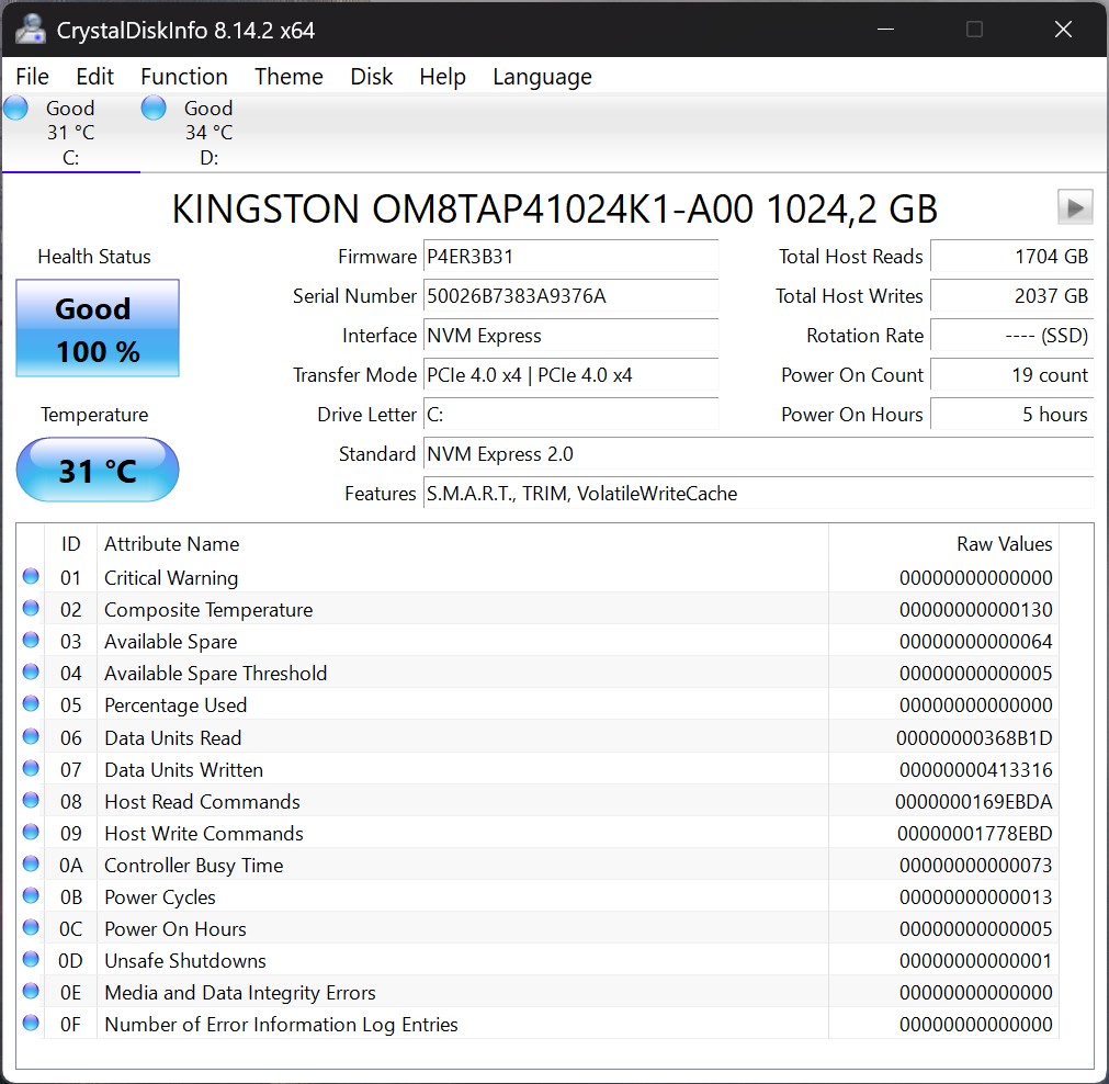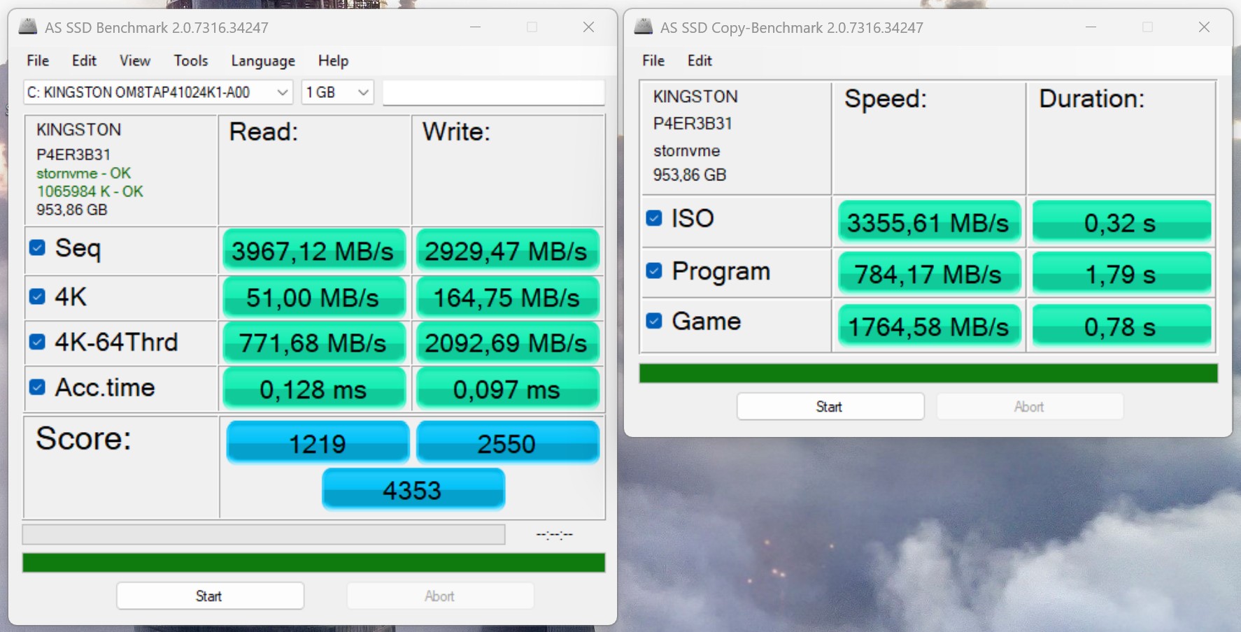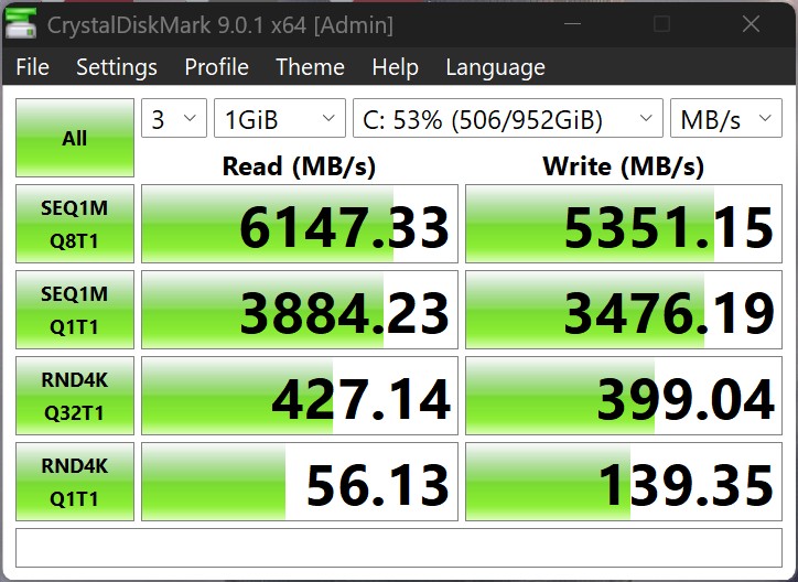 Minisforum AI X1, olağanüstü olmasa da güvenilir aktarım hızları sunan PCIe 4.0 x4 bağlantılı Kingston 1 TB SSD kullanmaktadır. Aktif soğutma da sürekli istikrarlı bir performans sağlar ve uzun süreli yük sırasında düşüşleri önler. Depolama için iki M.2 yuvası mevcuttur, ancak OCuLink adaptörü kullanımdayken bunlardan yalnızca biri kullanılabilir.