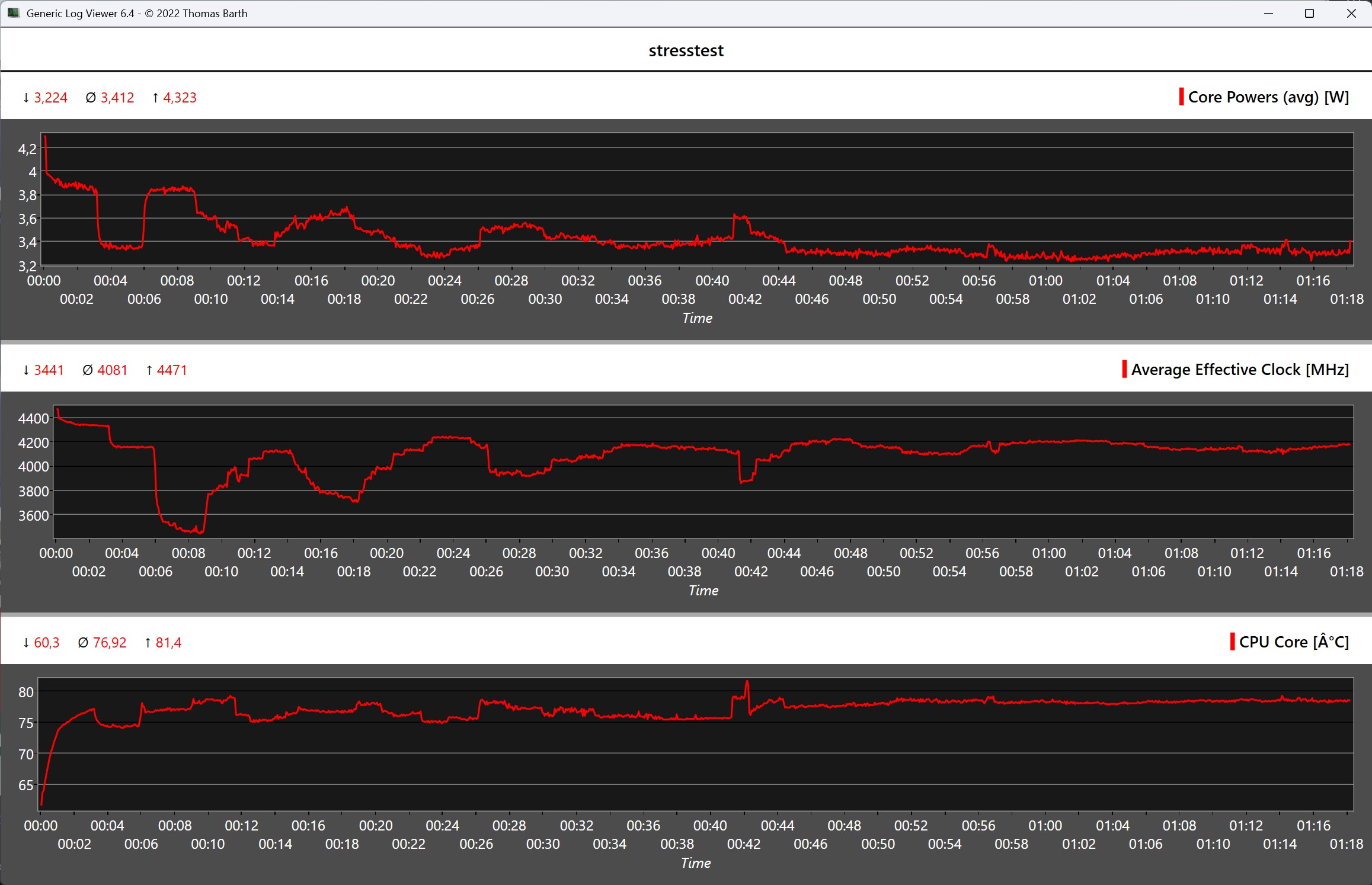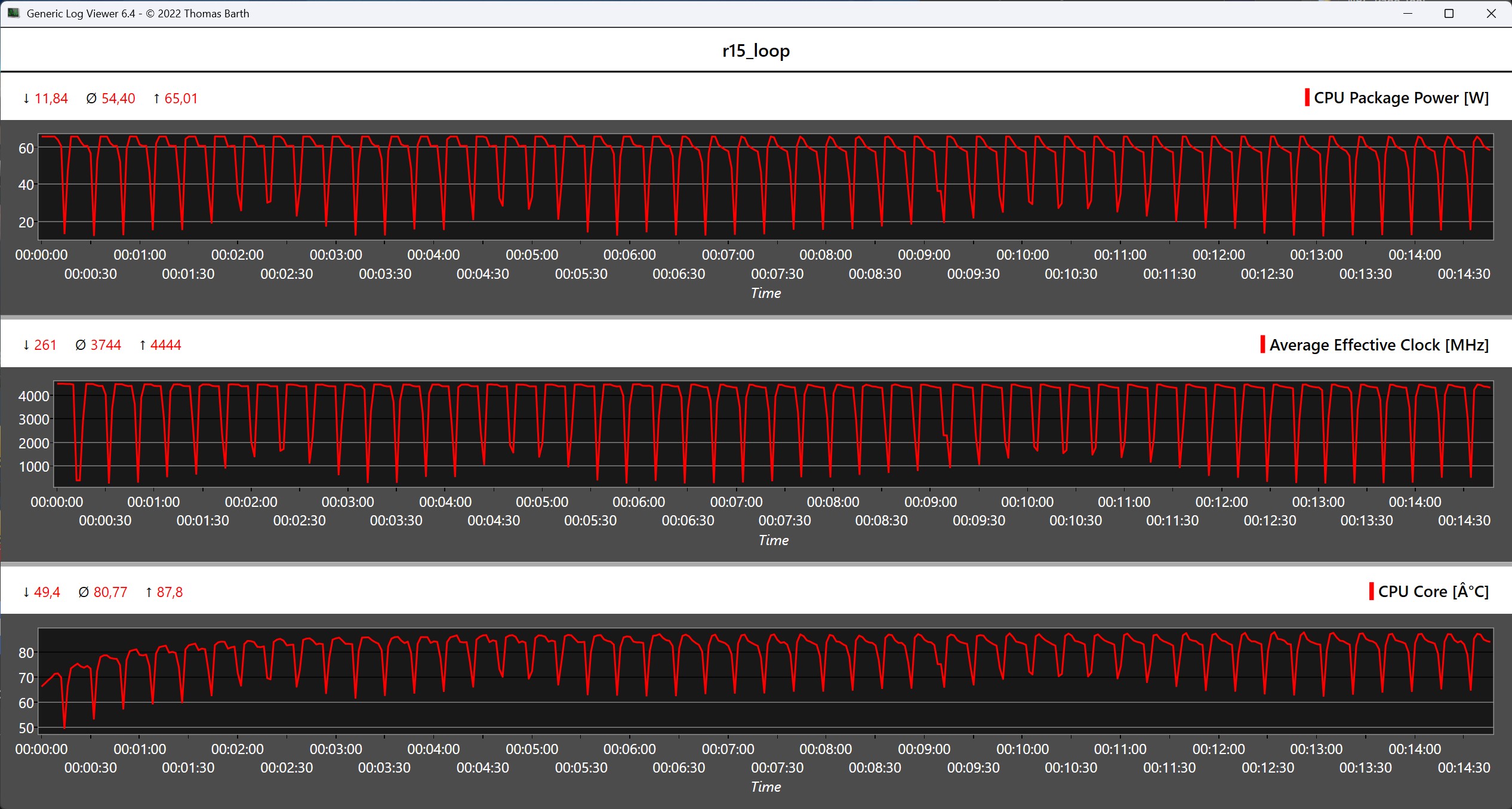 Cinebench R15 sürekli döngüsüyle yapılan ilk uzun stres testinde Minisforum AI X1, AMD Ryzen 7 255'in daha uzun sürelerde bile performansta önemli bir düşüş yaşamadığını gösteriyor. Telemetri verilerinin analizi, SoC'nin sürekli yük altında 54 watt'a kadar çalıştırılabileceğini kanıtlıyor. Ryzen 7 255'in sıcaklığı yaklaşık 88 C'de sabitleniyor.
