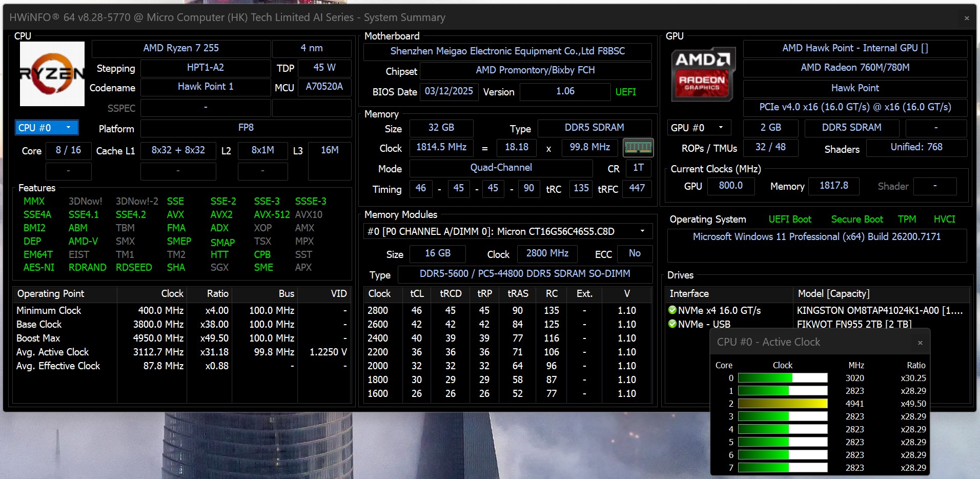 Bu AMD Ryzen 7 255 minisforum'da AI X1, modern mimarisi sayesinde sağlam tek ve çok çekirdekli performans sunar. Doğrudan bir karşılaştırmada, performans, üretici tarafından tanınabilir herhangi bir yapay performans sınırlaması olmaksızın, diğer 8 çekirdekli işlemcilerin beklenen seviyesindedir. SoC ayrıca 65 watt'a kadar kısa süreli güç tüketimi sağlayabiliyor.