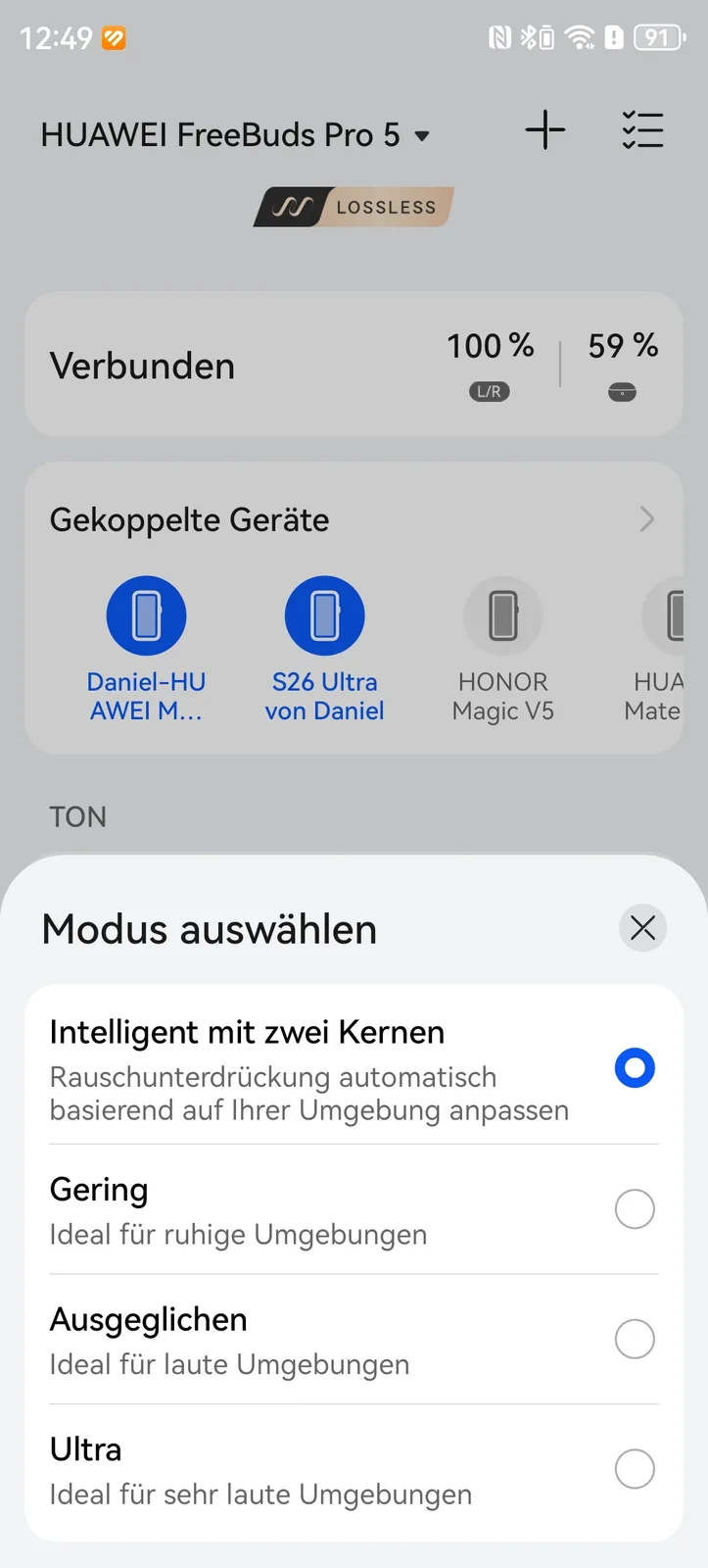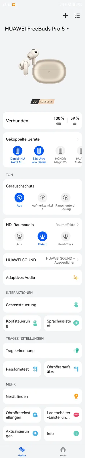 Uygulamada eşleştirilmiş cihazları yönetebilir, güncellemeleri yükleyebilir, ekolayzırı yapılandırabilir, uzamsal sesi ayarlayabilir ve çok daha fazlasını yapabilirsiniz. AAC codec Apple cihazları için kullanılabilirken, Android cihazları LDAC kullanabilir. Huawei akıllı telefon veya tablet sahipleri de şu anda en yeni modellerde 2,3 Mbps'ye kadar destekleyen kayıpsız akışa erişebiliyor. Ancak, geçen yılın modellerinin sahipleri aniden L2HC 3.0 veya 1.5 Mbps ile yetinmek zorunda. Bu durum, diğerlerinin yanı sıra, aşağıdakiler için de geçerlidir Pura 70 Ultra ve Mate XTdaha önce kullanabilen FreeBuds Pro 4 2,3 Mbps hızında. Huawei'nin kendi ürünlerini neden bu şekilde yapay olarak düşürdüğü bizim için bir sır olarak kalmaya devam ediyor.
