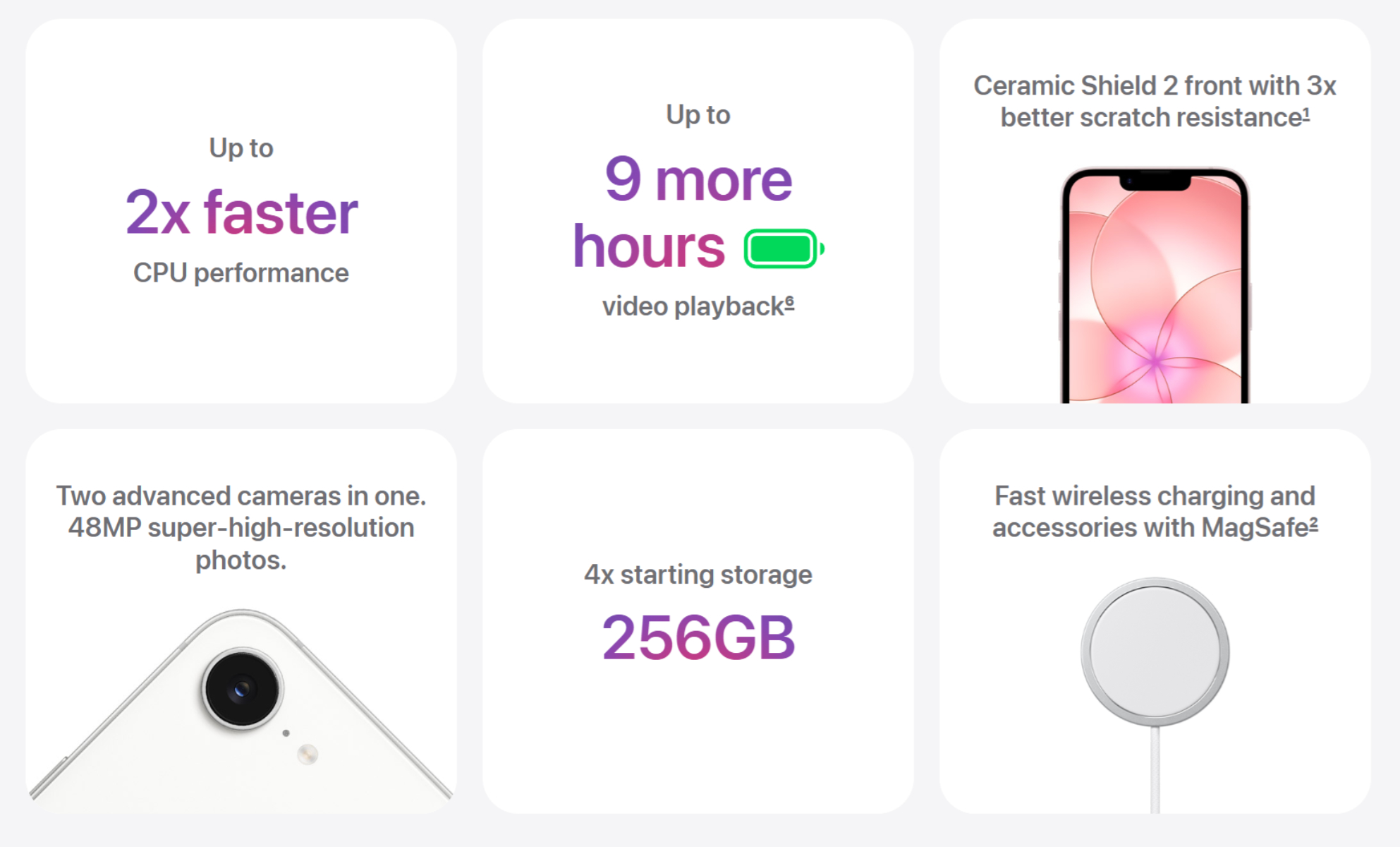 Diğer yükseltmeler arasında Ceramic Shield 2 cam, MagSafe ve Apple A19 yonga setinin benimsenmesi yer alıyor. Bu arada MagSafe, iPhone 17e'ye 2 g ağırlık ekleyerek kutudan 169 g ağırlığında çıkmasını sağlıyor. Ne yazık ki Apple iPhone 17e'de MagSafe şarjı 15 W ile sınırlandırmıştır.