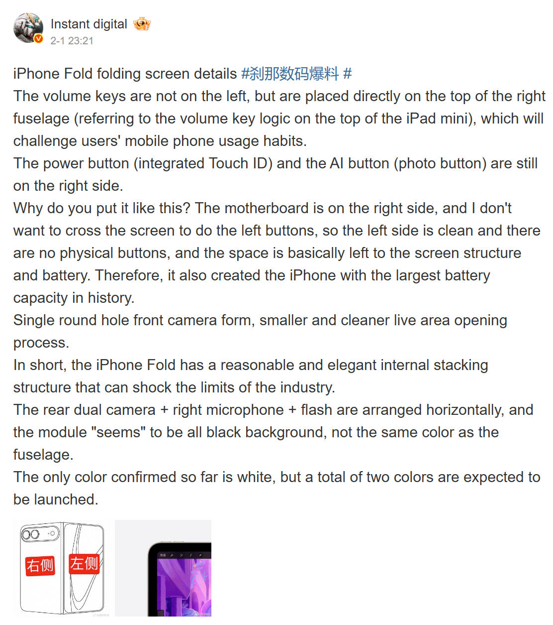 Diğer bir deyişle, Fixed Focus Digital, Apple'un katlanabilir cihazının %25 ve %10 pil avantajı ile piyasaya sürüleceğini öne sürüyor Galaxy Z Fold7 ve Pixel 10 Pro Katlamasırasıyla (Amazon'da 1.499 dolar). Daha yeni bir gönderide Instant Digital, Fixed Focus Digital'in iddiasını yineleyerek, katlanabilir cihazın sol tarafında fiziksel düğmelerin bulunmamasının Apple 'un pil kapasitesini en üst düzeye çıkarmasına olanak tanıdığını ekledi.