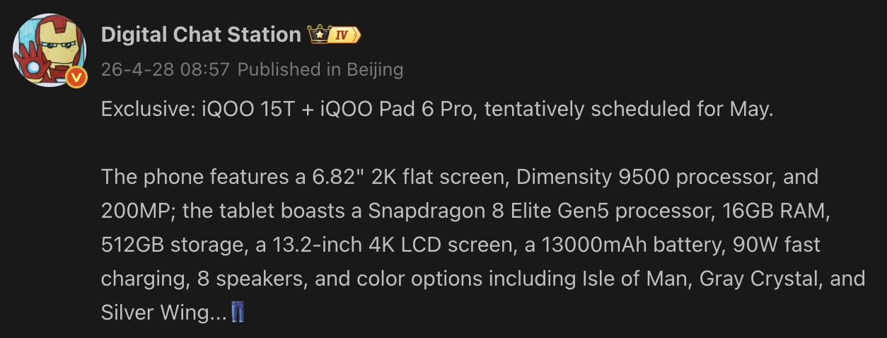 İhbarcı, iQoo Pad 6 Pro ve iQoo 15T'nin Mayıs ayında Çin'de piyasaya sürülebileceğini öne sürüyor. Ayrı bir haberde ise, yeni neslin ilk detayları Vivo X500 serisi ortaya çıktı.